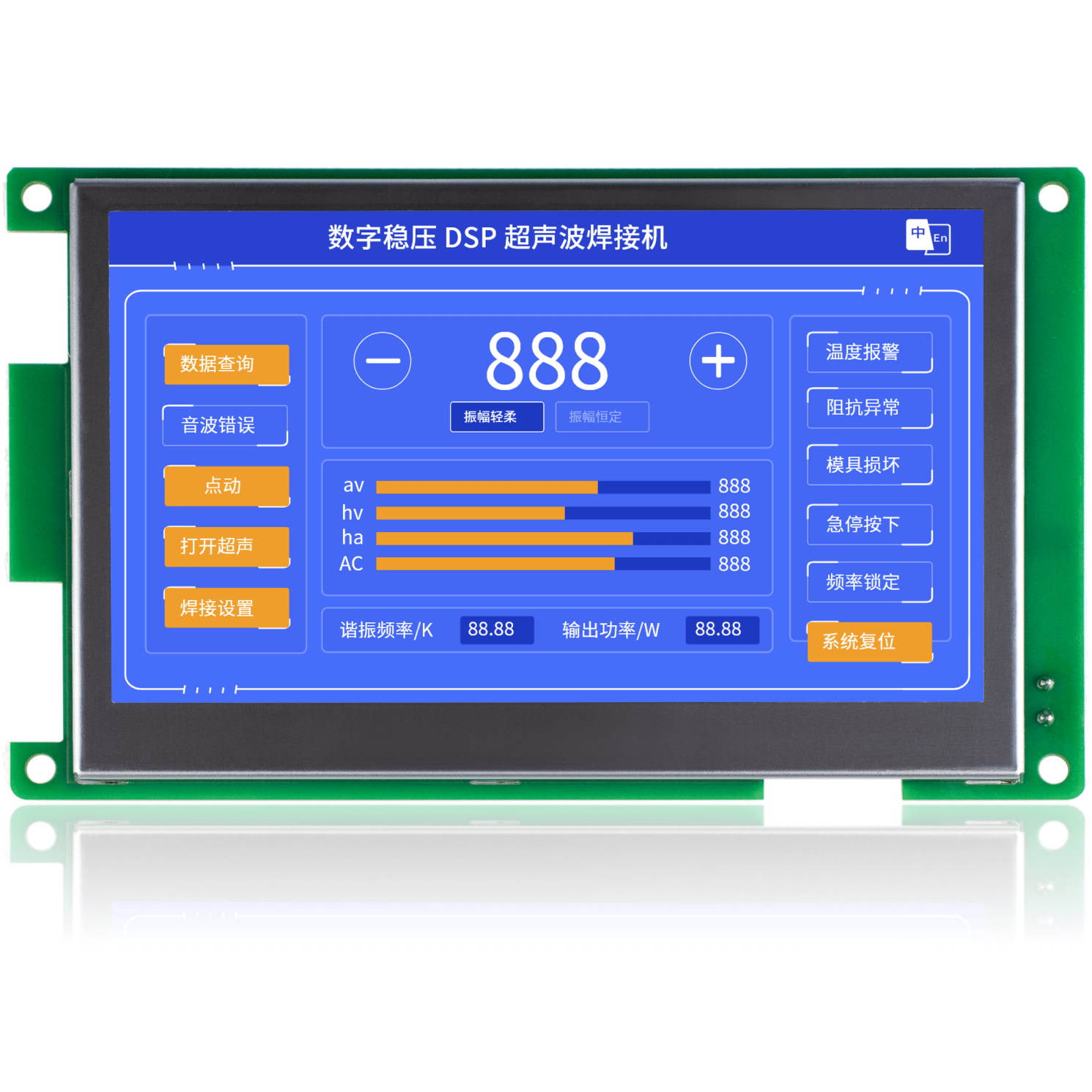 金璽HMI應用在超聲波控制上,安裝在控制機箱上對超聲波進行數據設定和監控。